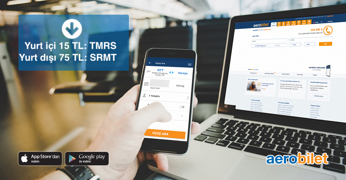 Aerobilet mobil uygulaması üzerinden yalnızca bugün (05.07.2018) saat 23:00’e kadar geçerli, sınırlı sayıda TMRS kupon kodunu kullanarak yurt içi uçak biletlerinde 15 TL, SRMT kupon kodunu kullanarak yurt dışı uçak biletlerinde 75 TL indirim anında kullanabilirsiniz. Seyahatlerinizi bir an önce planlamaya başlayın; bu fırsattan yararlanın!