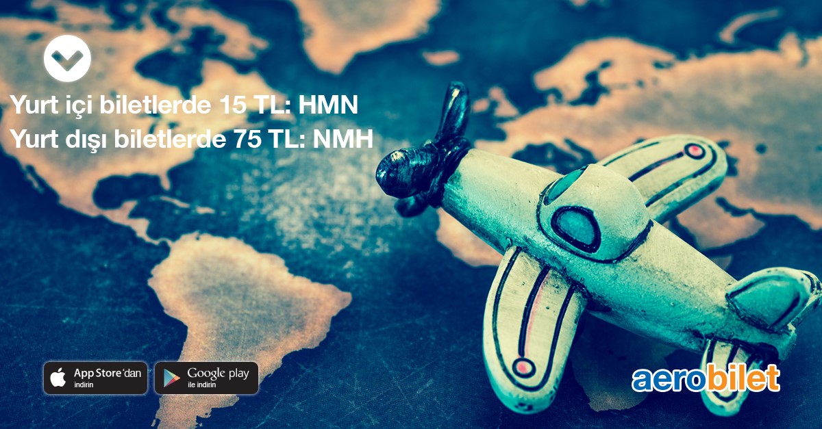 Aerobilet mobil uygulaması üzerinden yalnızca bugün (03.07.2018) saat 23.00’e kadar geçerli, sınırlı sayıda HMN kupon kodunu kullanarak yurt içi uçak biletlerinde 15 TL, NMH kupon kodunu kullanarak yurt dışı uçak biletlerinde 75 TL indirim anında kullanabilirsiniz. Seyahatlerinizi bir an önce planlamaya başlayın; bu fırsattan yararlanın!
