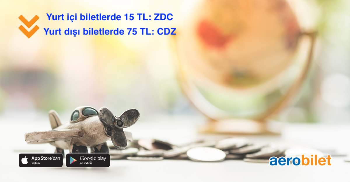 Aerobilet mobil uygulaması üzerinden yalnızca bugün (12.06.2018) saat 23.00’e kadar geçerli, sınırlı sayıda ZDC kupon kodunu kullanarak yurt içi uçak biletlerinde 15 TL, CDZ kupon kodunu kullanarak yurt dışı uçak biletlerinde 75 TL indirim anında kullanabilirsiniz. Seyahatlerinizi bir an önce planlamaya başlayın; bu fırsattan yararlanın!