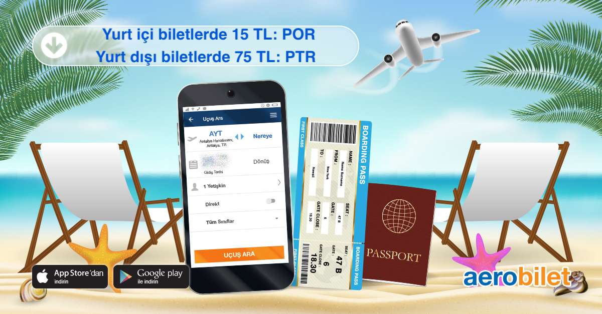 Yalnızca bugün (07.05.2018) saat 23.00’e kadar geçerli, sınırlı sayıda POR kupon kodunu kullanarak Aerobilet mobil uygulaması üzerinden alacağınız yurt içi uçak biletlerinde 15 TL, PTR kupon kodunu kullanarak alacağınız yurt dışı uçak biletlerindeyse tam 75 TL indirim sizleri bekliyor. Aerobilet mobil uygulamasını indirmediyseniz acele edin; indirimlerden bir an önce yararlanmaya başlayın.